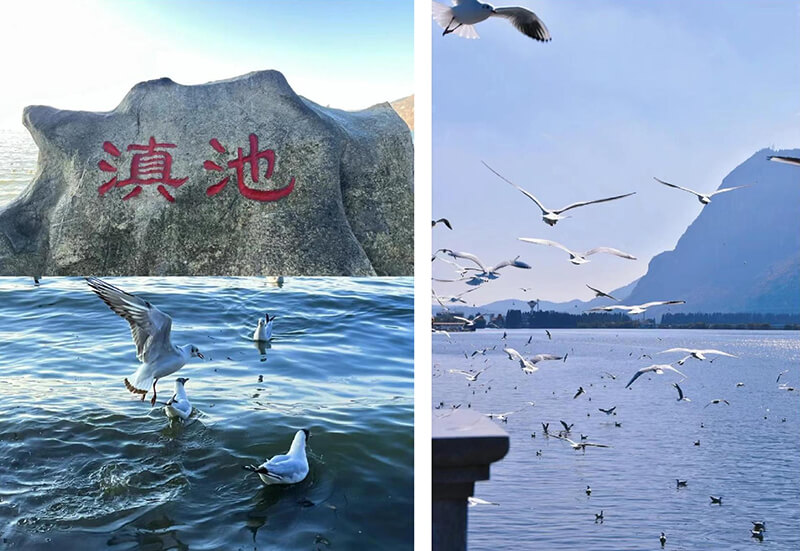 11月4日中午,旅行團(tuán)乘機(jī)順利抵達(dá)四季如春的昆明,乘車前往滇池大壩。每年11月至來年3月滇池海埂公園總會聚集成千上萬只來此過冬的紅嘴鷗,在湖面上翻飛的紅嘴鷗成為滇池冬季的一大景觀。