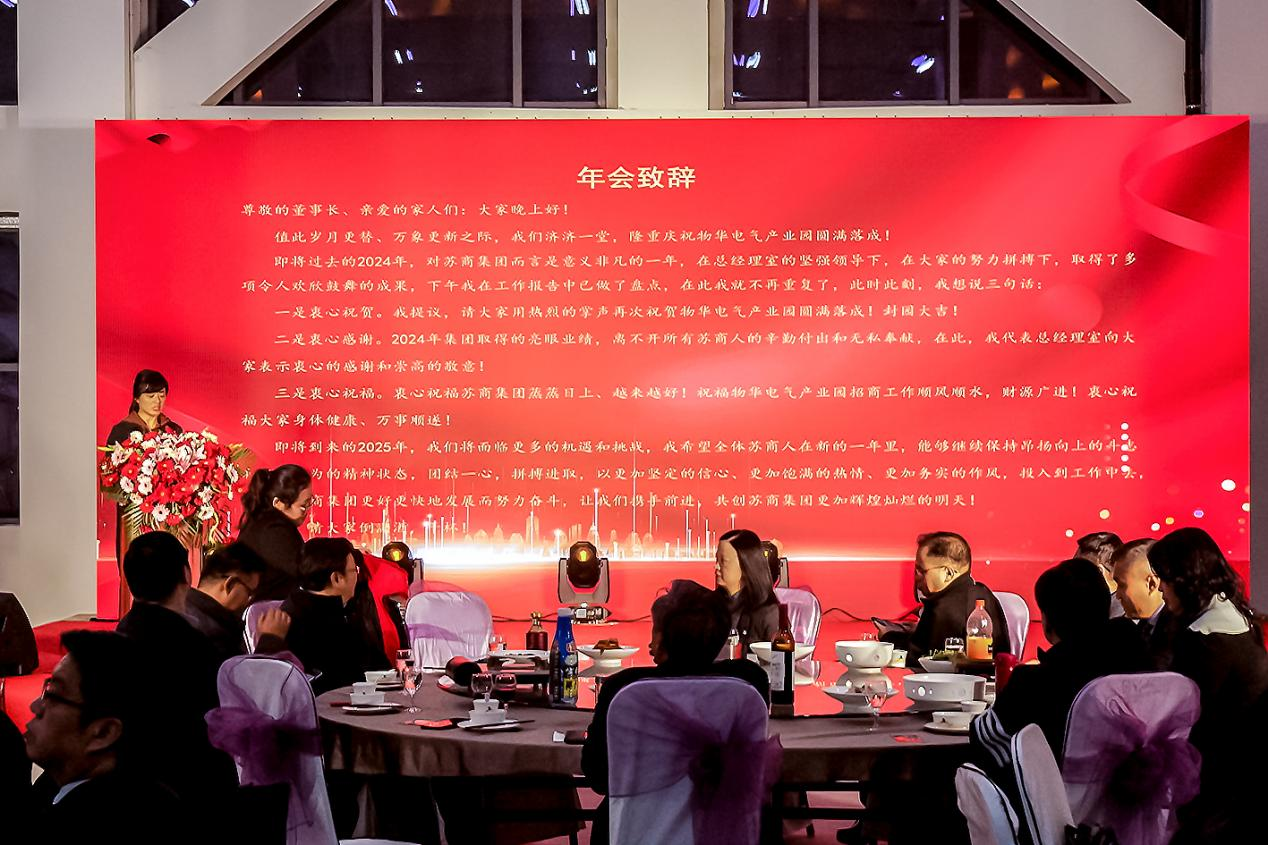 集團副總經(jīng)理潘麗女士發(fā)表了熱情洋溢的祝酒致辭,衷心感謝全體員工在過去一年里的辛勤付出,并給大家敬酒!祝福大家在新的一年里蛇序呈祥、萬事順?biāo)?!祝福南京蘇商集團創(chuàng)造出更加美好的新未來!