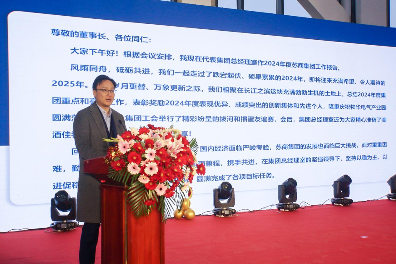 下午17:00點,慶祝大會開始,集團總經(jīng)理陳寅先生代表總經(jīng)理室作2024年度工作報告,全面總結(jié)了過去一年共創(chuàng)共進的發(fā)展成果,共同展望2025年即將迎來的新形勢、新機遇、新發(fā)展,共謀集團高質(zhì)量發(fā)展新格局。陳寅總經(jīng)理指出,今年以來,集團各事業(yè)部面對各種復(fù)雜的挑戰(zhàn),不忘初心、風(fēng)雨兼程、共克時艱,圓滿完成了年初制定的各項目標(biāo)任務(wù)。他特別指出,物華電氣產(chǎn)業(yè)園位于南京江寧濱江經(jīng)濟技術(shù)開發(fā)區(qū)盛安大道719號,占地180畝,建設(shè)面積10萬余平方米,總投資3.5億元,自2005年開工建設(shè)以來,歷經(jīng)近20年、四個階段的建設(shè),終于于今年圓滿落成,封園大吉,實屬來之不易,可喜可賀!